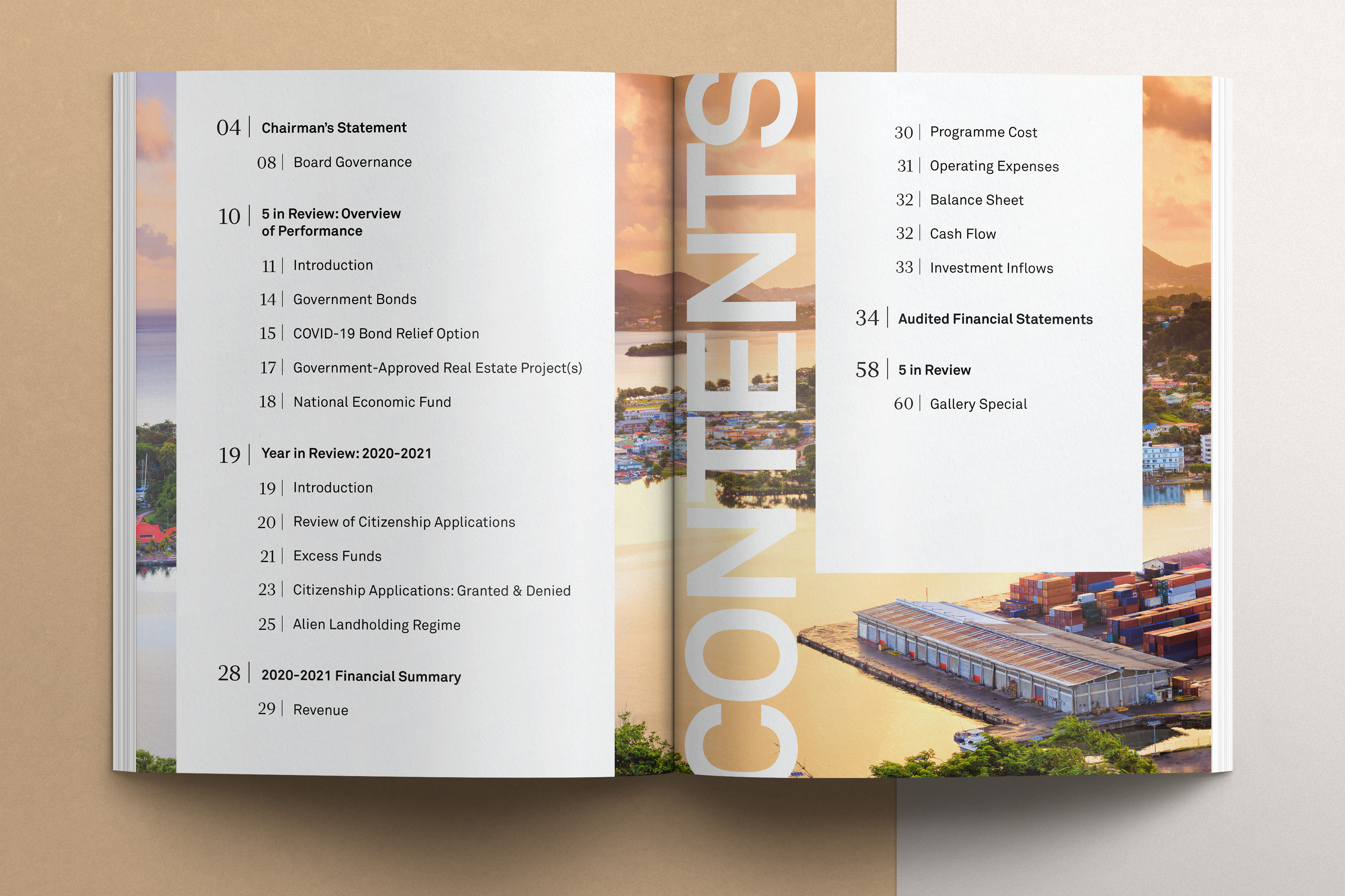 The design was inspired by a modern magazine, rather than a typical annual report. Like a magazine, it had a very strong focus on photography.  This allowed for a lot of opportunities to feature the island from aerial angles that have never been seen by many.